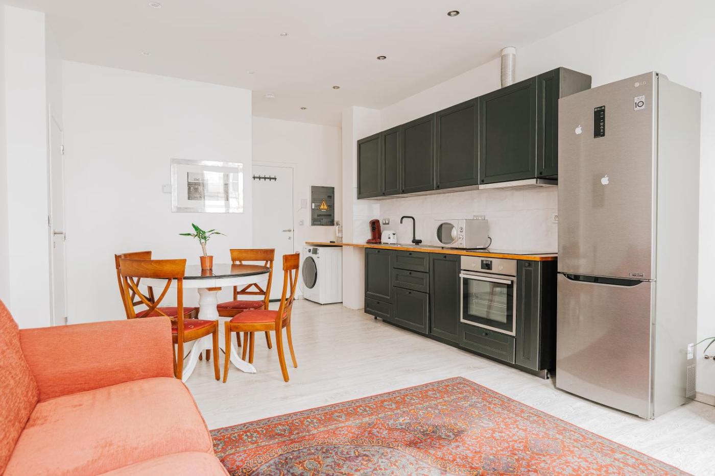 One-Bedroom Apartment. This apartment features 1 living room, 1 separate bedroom and 1 bathroom with a shower and free toiletries. Guests can make meals in the kitchen that features a refrigerator, an oven, a microwave and a toaster. The apartment has parquet floors, a seating area with a flat-screen TV with streaming services, soundproof walls, a coffee machine, as well as a dining area. The unit has 1 bed.